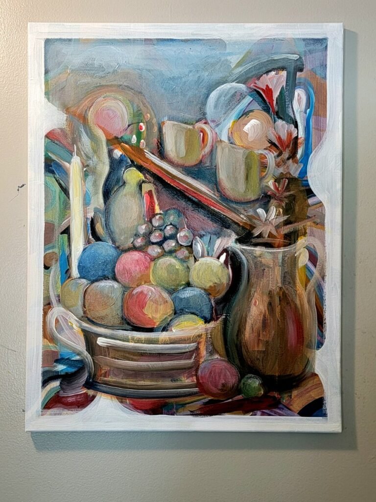 What makes the painting especially engaging is the way it moves between solidity and softness. The clustered fruit and vessels have weight and presence, while the flowing abstract backdrop opens the image into something more imaginative and atmospheric. The result is a still life that feels both grounded and inventive—an elegant fusion of classical subject matter and contemporary painterly expression.
