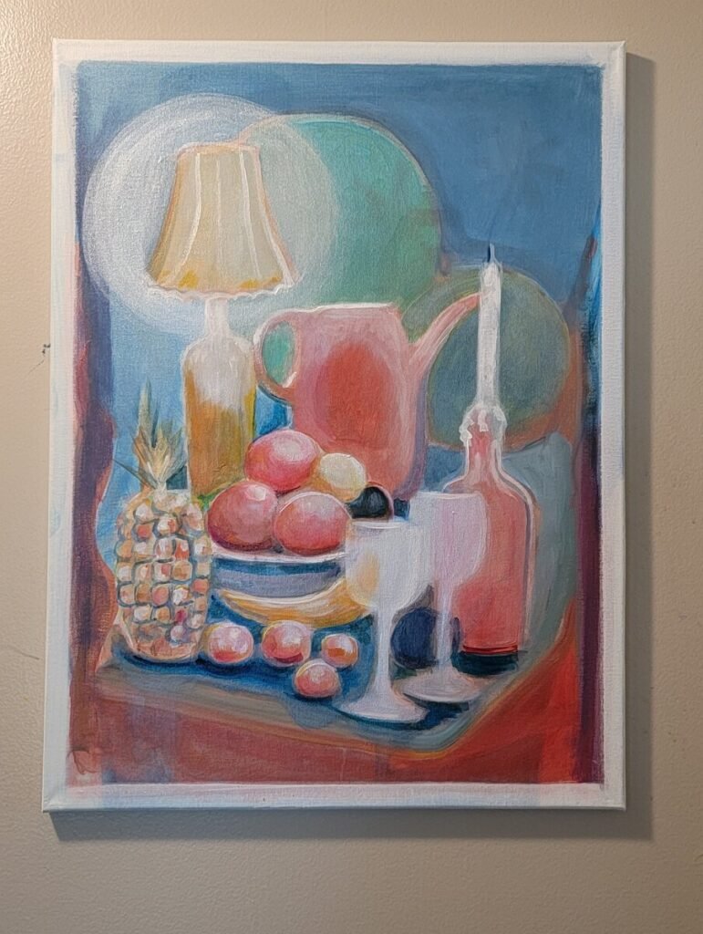What makes the painting especially effective is its balance between intimacy and abstraction. Large circular forms in the background create a spacious visual rhythm behind the more delicate arrangement of fruit and glassware, while pinks, blues, creams, and muted greens establish a palette that feels both fresh and restrained. The result is a still life of quiet intelligence—rooted in observation, but distilled into something more atmospheric, spacious, and modern.